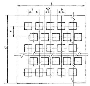 Примечания: 1. Сита с круглыми отверстиями имеют те же межцентровые расстояния t и t/2, что и квадратные отверстия. 2. Допускаемое отклонение шага квадратных и круглых отверстий для всех размеров должно составлять ± 1 мм. Площадь живого сечения сита (F0) в процентах вычисляют но формулам: для сит с квадратными отверстиями: