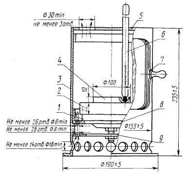 Утвержден Комитетом стандартов, мер и измерительных приборов при Совете Министров Союза ССР 13 января 1958 г. Срок введения установлен с 01.07.58 Проверен в 1982 г. Постановлением Госстандарта от 27.01.83 № 451 срок действия продлен до 01.07.95 Настоящий стандарт устанавливает метод определения фракционного состава нефтепродуктов путем испарения по способу Панок, Зусевой и Данилина. Сущность метода заключается в последовательном испарении испытуемого нефтепродукта, находящегося в тонком слое, при атмосферном давлении и постоянной скорости повышения температуры. Метод используют при проведении квалификационных испытаний масел для авиационных газотурбинных двигателей и судовых паро- и газотурбинных установок и в исследовательских испытаниях. (Измененная редакция, Изм. № 1, 2). I. АППАРАТУРА, РЕАКТИВЫ И МАТЕРИАЛЫ1. При проведении определения применяют следующую аппаратуру, реактивы и материалы: а) аппарат Папок (черт. 1), обеспечивающий равномерное нагревание до 400 °С диска и чашечек; б) (исключен, Изм. № 1); в) чашечки (черт. 2), изготовленные из алюминия марки АД-1 по ГОСТ 4784-74; г) терморегулятор температуры нагревательной пластины; Аппарат Папок 1 - электроподогревающий элемент (мощность 650 В×А); 2 - нагревательная пластинка; 3 - металлический корпус; 4 - диск; 5 - верхняя крышка; 6 - термометр; 7 - подвижная стеклянная дверца; 8 - накладка; 9 - нижняя крышка Черт. 1 Черт. 2 д) термометр типа ТН-2 по ГОСТ 400-80 (с ртутным резервуаром длиной 7,0 ± 0,5 мм); е) ванночка для промывки чашечек; ж) настольное стекло для очистки и шлифовки диска; з) (исключен, Изм. № 1); и) эксикатор по ГОСТ 25336-82; к) керамиковая плитка; л, м) (исключены, Изм. № 1); н) палочка стеклянная; о) сплав металлический с температурой плавления не выше 100 °С (типа сплава Вуда); п) шкурка шлифовальная с зернистостью не более 8 по ГОСТ 6456-82 или ГОСТ 5009-82, или другой нормативно-технической документации, обеспечивающая заданную шероховатость; р) бензин легкий прямой гонки; с) (исключен, Изм. № 1); т) весы аналитические; у) электроплитка с закрытой спиралью.
