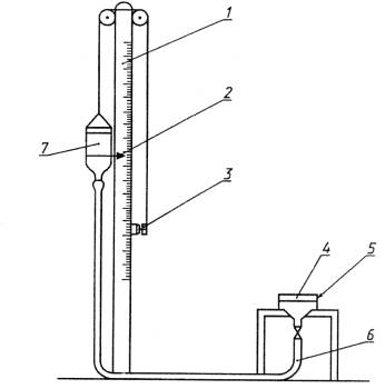 9841-94 МЕЖГОСУДАРСТВЕННЫЙ СТАНДАРТ Бумага и картон МЕТОД ОПРЕДЕЛЕНИЯ ВОДОНЕПРОНИЦАЕМОСТИ Paper and board. Determination of resistance to water penetration Дата введения 2000-01-01 Свойство бумаги и картона оказывать сопротивление проникновению воды с одной стороны листа на другую достигается поверхностной проклейкой или проклейкой в массе, путем ламинирования водонепроницаемыми материалами и другими способами. 1 Область примененияНастоящий стандарт устанавливает метод определения водонепроницаемости и распространяется на бумагу и картон. Метод не распространяется на гофрированный картон, но может быть применим к компонентам таких видов картона. 2 Нормативные ссылкиВ настоящем стандарте использованы ссылки на следующие стандарты: ГОСТ 6709-72 Вода дистиллированная. Технические условия ГОСТ 8047-93 (ИСО 186-85) Бумага и картон. Правила приемки. Отбор проб для определения среднего качества ГОСТ 13523-78 Полуфабрикаты волокнистые, бумага и картон. Метод кондиционирования образцов 3 ОпределенияВ настоящем стандарте принят следующий термин и определение: водонепроницаемость - свойство бумаги (картона) не пропускать воду с поверхности одной стороны листа на другую. 4 Сущность методаСущность метода заключается в измерении времени, по истечении которого вода проникает через образец бумаги (картона) на другую сторону при условиях, установленных настоящим стандартом. 5 РеактивыДистиллированная вода по ГОСТ 6709. Краситель - эозин (1 г на 1000 см3 воды). Примечания 1 Допускается применение другого красителя при условии, что его концентрация соответствует концентрации эозина. Применение другого красителя оговаривается в протоколе испытаний. 2 Температура воды должна соответствовать режиму кондиционирования, указанному в нормативной документации на продукцию. 6 Аппаратура6.1 Для испытаний применяют следующую аппаратуру: 6.1.1 Прибор для определения водонепроницаемости (рисунок 1), который имеет: 1 - шкала с ценой деления 1 мм; 2 - подъемное устройство; 3 - указатель; 4 - зажим; 5 - испытуемый образец; 6 - резиновая трубка; 7 - сосуд для воды Рисунок 1 - Схема прибора - цилиндрическую металлическую камеру внутренним диаметром (112,8 ± 0,2) мм, соединенную трубкой с краном для подвода и слива воды. Допускается применение камеры внутренним диаметром (80,0 ± 0,1) мм; - металлическое съемное кольцо внутренним диаметром (112,8 ± 0,2) мм, обеспечивающим герметичность при зажатии образца. Допускается применение кольца внутренним диаметром (80,0 ± 0,1) мм; - резиновую прокладку внутренним диаметром (112,8 ± 0,2) мм. Допускается применение прокладки внутренним диаметром (80,0 ± 0,1) мм; - зажимное устройство; - манометр водяной, позволяющий измерять давление воды до 1000 мм (9,80 кПа). Примечание - Допускается применение других типов приборов, принцип измерения которых представлен на рисунке. Применение другого типа прибора отмечают в протоколе испытаний. 6.1.2 Хронометр или другое средство для измерения времени. 7 Отбор проб7.1 Отбор проб для испытания проводят по ГОСТ 8047 со следующим дополнением: из листов пробы произвольно отбирают четыре листа для испытания. 8 КондиционированиеКондиционирование испытуемых образцов проводят по ГОСТ 13523. Режим и продолжительность кондиционирования - по нормативной документации на продукцию. 9 Подготовка к испытаниям9.1 Подготовку образцов к испытанию проводят в тех же условиях, что и кондиционир
