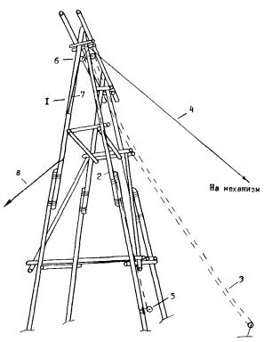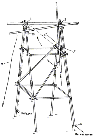 концы оттяжек (8, 9) крепятся к вспомогательным тяговым механизмам, причем,