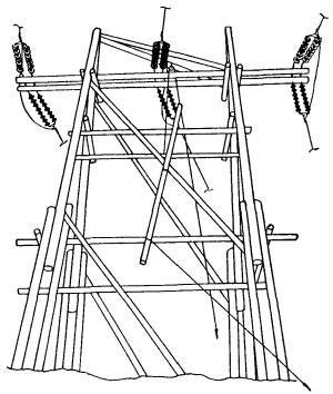 концы оттяжек крепятся к стволам деревьев, пням и т.п. Натяжение оттяжек