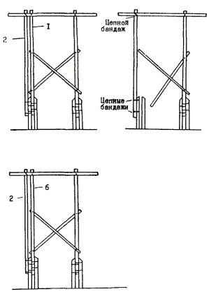 устанавливаются три временные оттяжки, закрепленные за стойку опоры. Вторые