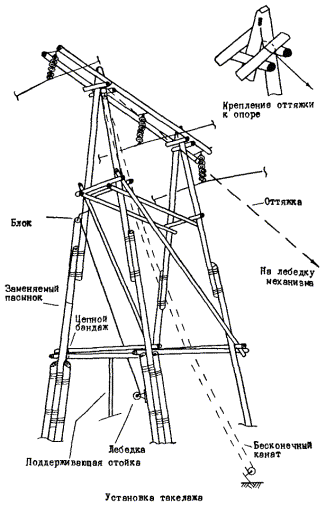 слабина всех тросов, начинается подъем опоры через траверсу старой опоры.