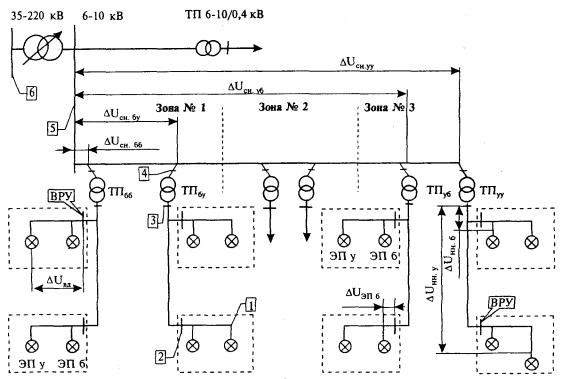 где II, III - нагрузка элемента сети соответственно в режиме наибольших и наименьших нагрузок ЦП; DUI, DUII - потери напряжения на элементе сети соответственно в режиме наибольших и наименьших нагрузок ЦП. Рисунок А.2. Схема распределительной электрической сети А.4.7. Фактические значения потерь напряжения в элементах электрической сети, как правило, не должны превышать следующих значений: - для внутридомовых сетей с учетом возможной несимметрии нагрузок - 3 %; - для сетей напряжением до 1000 В, включая внутридомовые сети - 5 - 6 %; - для электрических сетей напряжением 6 - 35 кВ, включая потери в трансформаторах 6 - 35/0,4 кВ, и с учетом возможной неоднородности нагрузок ТП - 5 - 6 %. Рекомендуется следующий порядок выбора регулировочных ответвлений трансформаторов ТП: - разделяют присоединенную к ЦП распределительную сеть на зоны шириной 2,5 % по потере напряжения от шин ЦП до ближайшего к шинам низкого напряжения ТП электроприемника; Таблица А.1 Формулы для определения границ диапазона нормально допускаемых значений установившегося отклонения напряжения в пункте контроля