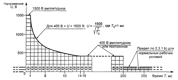 где Uac - амплитудное значение напряжения переменного тока при любой частоте, В Udc - значение напряжения постоянного тока, В. Примечания 2 Если значение напряжения Udc равно нулю, то значение напряжения Uac не может быть более 70,7 В амплитудного значения. 3 Когда значение напряжения Uac равно нулю, то значение напряжения Udc не может быть более 120 В; допуски на рисунке 2D измерены на резисторе сопротивлением 5000 Ом ±2% в случае единичного повреждения изоляции (см. 1.4.14) внутри оборудования. Соответствие определяют проверкой или измерением. Примечание 4 - В существующей ТЕЛЕКОММУНИКАЦИОННОЙ СЕТИ могут присутствовать сигналы телеграфа или телетайпа. Использование этих устройств считают устаревшим, и характеристики таких сигналов в ЦЕПЯХ НТС в настоящем стандарте не рассматривают. 2.3.2 Отделение от других цепей и доступных частей оборудованияПримечание 1 - См. также 6.1.2 и 6.2. Допуски для ЦЕПЕЙ НТС-2 и НТС-3 при единичных выходах из строя изоляции (см. 1.4.14), отделенных от ЦЕПЕЙ БСНН, НТС-1 и доступных проводящих частей, должны удовлетворять требованиям 2.3.1b и в нормальных рабочих условиях не превышать соответствующих допусков для ЦЕПЕЙ БСНН, НТС-1 и доступных проводящих частей. Примечания 2 В Канаде и Соединенных Штатах в этом случае применяют допуски по 2.2.3. 3 В нормальных рабочих условиях допуски по 2.2.2 всегда применяют к каждой ЦЕПИ БСНН и доступной проводящей части. 4 Допуски по 2.3.1 всегда применяют к каждой ЦЕПИ НТС. Требования по отделению будут удовлетворены, если ОСНОВНАЯ ИЗОЛЯЦИЯ обеспечивается, как указано в таблице 2G (см. 2.9.5). Другие решения не применяют. ОСНОВНАЯ ИЗОЛЯЦИЯ не требуется, если удовлетворяются все следующие условия: - ЦЕПИ БСНН, НТС-1 или доступная проводящая часть присоединены к клемме защитного заземления в соответствии с 2.6; - для ОБОРУДОВАНИЯ, ПОДКЛЮЧЕННОГО СОЕДИНИТЕЛЕМ ТИПА А, предусмотрена клемма отдельного защитного заземления в дополнение к основной клемме защитного заземления в соответствии с 2.6.4.1. В инструкциях по сборке должно быть точно определено, что эта отдельная клемма имеет постоянное соединение с землей; - ОБОРУДОВАНИЕ, ПОДКЛЮЧЕННОЕ СОЕДИНИТЕЛЕМ ТИПА В, должно соответствовать каждому из приведенных выше требований для ОБОРУДОВАНИЯ, ПОДКЛЮЧЕННОГО СОЕДИНИТЕЛЕМ ТИПА А, или должны быть предусмотрены обе маркировки на оборудовании и даны указания в инструкциях по сборке, точно определяющие, что ПОЛЬЗОВАТЕЛЬ должен отключить все соединители ТЕЛЕКОММУНИКАЦИОННОЙ СЕТИ до отсоединения питания. Примечание 5 - Предполагается, что ОБОРУДОВАНИЕ, ПОДКЛЮЧЕННОЕ ПОСТОЯННО, имеет основной зажим заземления, соединенный с землей; - испытания 2.3.5 проводят, если ЦЕПЬ НТС-2 или НТС-3 предназначена принимать сигналы или мощность, генерируемые вне оборудования при нормальных условиях работы (например, в ТЕЛЕКОММУНИКАЦИОННОЙ СЕТИ). По выбору изготовителя допускается трактовать ЦЕПИ НТС-1 и НТС-2 как ЦЕПИ НТС-3. В этом случае ЦЕПЬ НТС-1 или НТС-2 должна удовлетворять всем требованиям по разъединению для ЦЕПИ НТС-3. Соответствие проверяют обследованием, измерением и, при необходимости, имитацией неисправности компонентов и изоляции так, как это может произойти в оборудовании. Перед испытаниями изоляцию, не удовлетворяющую требованиям для ОСНОВНОЙ ИЗОЛЯЦИИ, замыкают накоротко. Примечания 6 В случаях, когда предусмотрена ОСНОВНАЯ ИЗОЛ