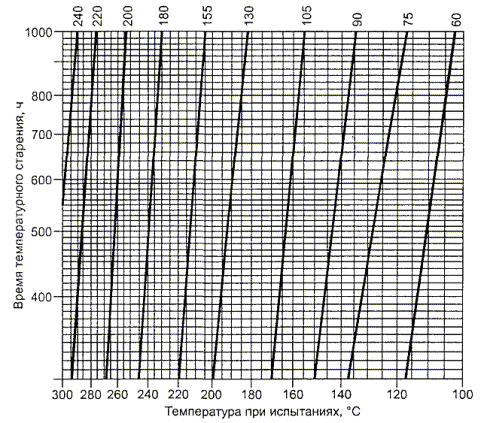 2.10.6.3 Испытание тепловыми циклами Образец № 1 подвергают десятикратным испытаниям при следующей последовательности температурных циклов: 68 ч - при (Т1 ± 2) °С; 1 ч - при (25 ± 2) °С; 2 ч - при (0 ± 2) °С; не менее 1ч - при (25 ± 2) °С. Т1 = Т2 + Тмакс.окр - Токр + 10 °С (измеряют в соответствии с 1.4.5 или, где уместно, согласно 1.4.13), или Т1 = 100 ºС; выбирают наибольшее значение. Однако 10 °С не добавляют, если температура измерена с помощью встроенной термопары. Т2 - температура частей, измеренная во время испытаний в соответствии с 4.5.1. Значения Тмакс.окр и Токр даны в 1.4.12. Время перехода от одной температуры к другой не регламентируют; допускается постепенный переход. 2.10.6.4 Тепловое старение Образец № 2 выдерживают в вытяжной камере при температуре и длительности, взятых из диаграммы рисунка 2G, используя линию температурного индекса, которая соответствует максимальной рабочей температуре платы с покрытием. Температура в камере должна поддерживаться с точностью ±2 ºС. При определении линии температурного индекса выбирают наибольшую температуру на плате, которая безопасна для прикосновения. При использовании рисунка 2G допускается интерполяция между двумя близлежащими линиями температурных индексов. Температурный индекс, °С Рисунок 2G - Время теплового старения 2.10.6.5 Испытания на электрическую прочность Образцы № 1 и 2 затем подвергают испытаниям в условиях влажности в соответствии с 2.9.2 (48 ч), при этом они должны выдерживать испытания по 5.2.2 на электрическую прочность между проводниками. 2.10.6.6 Испытание на износостойкость Образец № 3 печатной платы подвергают следующему испытанию. Наносят царапины поперек пяти пар проводников с целью нарушить покрытие в точках, где при испытаниях это наиболее возможно. Царапины наносят иглой из закаленной стали, которая имеет конец в форме конуса с углом при вершине 40°; вершина должна быть скруглена радиусом (0,25 ± 0,02) мм и отшлифована. Царапины наносят прочерчиванием иглой по поверхности платы в плоскости, перпендикулярной краям проводников, со скоростью (20 ± 5) мм/с в соответствии с рисунком 2Н2 Н. Игла должна прижиматься таким образом, чтобы усилие, приложенное вдоль оси, составляло (10 ± 0,5) Н. Царапины должны находиться на расстоянии не менее 5 мм друг от друга и края образца. После испытания покрывающий слой не должен ни нарушаться, ни иметь трещин и должен выдерживать испытание на электрическую прочность между проводниками в соответствии с 5.2.2.