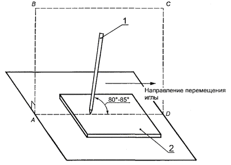 1 - игла; 2 - испытуемый образец Рисунок 2Н - Испытание покрывающего слоя на износостойкость Примечание - Игла находится в плоскости ABCD, перпендикулярной плоскости испытуемого образца 2.10.7 Закрытые корпусом и залитые составные частиДля компонентов или сборочных узлов, которые надежно покрыты или герметично защищены от пыли и влаги, степень загрязнения I применяют для внутренних ЗАЗОРОВ и ПУТЕЙ УТЕЧКИ. Примечание - В некоторых образцах части такой конструкции заключают в коробки, которые герметично заливают связующим материалом, и покрытые части помещают в оболочку. Соответствие проверяют обследованием с внешней стороны, измерением и, если необходимо, испытанием. Деталь или сборочный узел считают в достаточной мере закрытыми, если образец выдерживает следующую последовательность испытаний. Образец подвергают десятикратным испытаниям при следующей последовательности температурных циклов: 68 ч - при (Т1 ± 2) °С; 1 ч - при (25 ± 2) °С; 2 ч - при (0 ± 2) °С; не менее 1ч - при (25 ± 2) °С. Т1 = Т2 + Тмакс.окр - Токр + 10 °С (измеряют в соответствии с 1.4.5 или, где уместно, согласно 1.4.13), или Т1 = 85 ºС; выбирают наибольшее значение. Однако 10 °С не добавляют, если температура измерена с помощью встроенной термопары. Т2 - температура частей, измеренная во время испытаний в соответствии с 4.5.1. Значения Тмакс.окр и Токр даны в 1.4.12. Время перехода от одной температуры к другой не регламентируют; допускается постепенный переход. Образец после охлаждения до комнатной температуры подвергают в условиях влажности по 2.9.2 испытаниям на электрическую прочность в соответствии с 5.2.2. Для трансформаторов и аналогичных устройств, у которых изоляция обеспечивает безопасность, во время температурного цикла между обмотками подают напряжение среднеквадратического значения 500 В с частотой от 50 до 60 Гц. Во время испытания не допускается очевидное нарушение изоляции. 2.10.8 Объемы, заполненные изолирующим компаундомВ случаях, когда промежутки между токопроводящими частями эффективно заполнены изолирующим компаундом, включая и те, где изоляция надежно скреплена с изолирующим компаундом таким образом, что отсутствуют ЗАЗОРЫ и ПУТИ УТЕЧКИ, применяют требования только к расстоянию через изоляцию по 2.10.5.1. Примечания 1 Некоторые примеры такой обработки - заливка, вакуумная пропитка и герметизация. 2 Примером приемлемых форм конструкции могут служить: - компоненты или сборочные узлы, пропитанные изолирующим компаундом, заполняющим пустоты; - внутренняя изоляция многослойных печатных плат. Соответствие проверяют обследованием, измерением и испытаниями. Не производят измерения ЗАЗОРОВ и ПУТЕЙ УТЕЧКИ, если образцы прошли испытания на температурные циклы, влажность и электрическую прочность согласно 2.10.7. В этом случае применяют следующее: - для компонентов, где изолирующий компаунд образует сплошную изоляцию между проводящими частями, испытывают один законченный компонент. Испытания проводят последующим выполнением разрезов и измерением. Не должно быть ни трещин, ни пустот в изолирующем компаунде, которые могут повлиять на выполнение требований 2.10.5.1; - для компонентов, где изолирующий компаунд образует скрепляющий слой между изолирующими частями, электрическую прочность определяют на трех образцах, испытывая непосредственно скрепленные стыки. Если в компоненте используют обмот