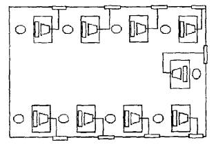 Цифрами на рисунках обозначены: 1. Рабочее место оператора 2. Клавиатура 3. Монитор 4. Системный блок ПЭВМ 5. Принтер 6. Розетки питания 7. Сетевые кабели питания блоков ПЭВМ 3. Рекомендуемое размещение оборудования в классах.