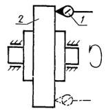 На станине станка устанавливают показывающий прибор 1 (черт. 2) так, чтобы его измерительный наконечник касался торцовой обработанной поверхности обода пильного шкива 2 и был перпендикулярен к ней в плоскости измерения.