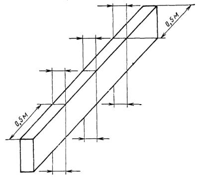 Толщину досок измеряют штангенциркулем по обеим кромкам в трех сечениях: двух крайних на расстоянии 0,5 м от края доски и одном посередине доски (черт. 6).