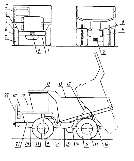 R1 - радиус поворота; R2 - габаритный радиус поворота; а - землевоз с жесткой рамой; b - землевоз со сдвоенным задним мостом, с - полуприцепной землевоз Черт. 12 5.3. Масса 5.3.1. Эксплуатационная масса - масса базовой машины с порожним кузовом, с полностью заправленными топливным баком, гидросистемой, системами смазывания и охлаждения и с учетом массы оператора (75 кг). 5.3.2. Масса груженой машины - сумма эксплуатационной массы и массы номинального груза, указанной изготовителем. 5.3.3. Распределение массы по осям - масса, приходящаяся на каждую ось машины в порожнем и груженом состояниях. 5.3.4. Отгрузочная масса - масса базовой машины без оператора, с порожним кузовом, с полностью заправленными гидросистемой, системами смазывания и охлаждения, с 10 %-ной заправкой топливного бака, а также с кабиной, тентом и устройством ROPS* или без них по указанию изготовителя. ____________ * ROPS - устройства защиты при опрокидывании. 5.3.5. Масса кабины, тента, устройства ROPS - масса кабины, тента и устройства ROPS со всеми их составными частями и элементами крепления к базовой машине. 5.4. Наименования составных частей 5.4.1. Наименования составных частей двухосного землевоза: 1 - бампер; 2 - шкворень буксирного приспособления; 3 - кабина; 4 - крыло; 5 - колесо; 6 - шина; 7 - тормоз; 8 - брус выталкивателя кусков породы; 9 - подвеска (дополнительная); 10 - ось шарнира крепления кузова; 11 - мост (мосты); 12 - стойка, удерживающая поднятый кузов; 13 - кузов; 14 - гидроцилиндр подъема кузова; 15 - система привода; 16 - трубопровод отвода выхлопных газов в атмосферу или на обогрев кузова; 17 - козырек; 18 - основная рама; 19 - капот; 20 - лестница, 21 - силовая установка; 22 - решетка радиатора.
