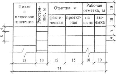 Выше проектной линии наносят и указывают: - обозначения раздельных пунктов, их наименования и расстояния между ними; - обозначения проектируемых искусственных сооружений и их привязку к пикетам; - проектные уклоны и расстояния; - обозначения реперов, инженерных надземных сетей, переездов (примыканий - для реконструируемых железнодорожных путей); - рабочие отметки насыпи (при необходимости). Ниже проектной линии наносят: - линии ординат от точек переломов проектной линии; - подземные инженерные коммуникации; - условные обозначения проектируемых и существующих искусственных сооружений; - пикеты; - фактические отметки земли и проектные отметки бровки земляного полотна; - рабочие отметки выемки (при необходимости); - тип поперечного профиля; - неправильные пикеты, отметки головки рельса существующего и проектируемого пути, план левого и правого пути, указатели километров (при реконструкции железнодорожного пути). 6.4. При отходе проектируемого железнодорожного пути от существующей станции проектную линию в месте перехода от отметки головки рельса к бровке земляного полотна изображают ступенькой. 6.5. При большом числе плюсовых точек между отдельными пикетами на листе продольного профиля помещают таблицу по форме 10.