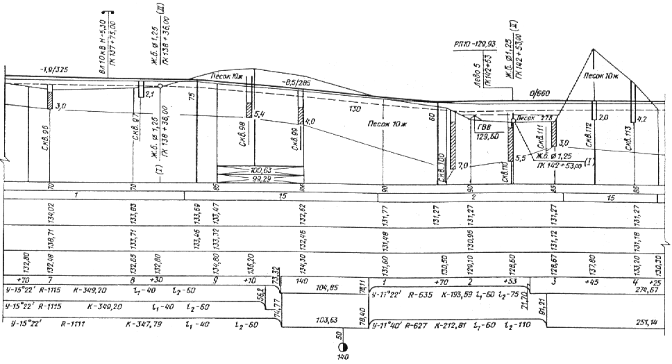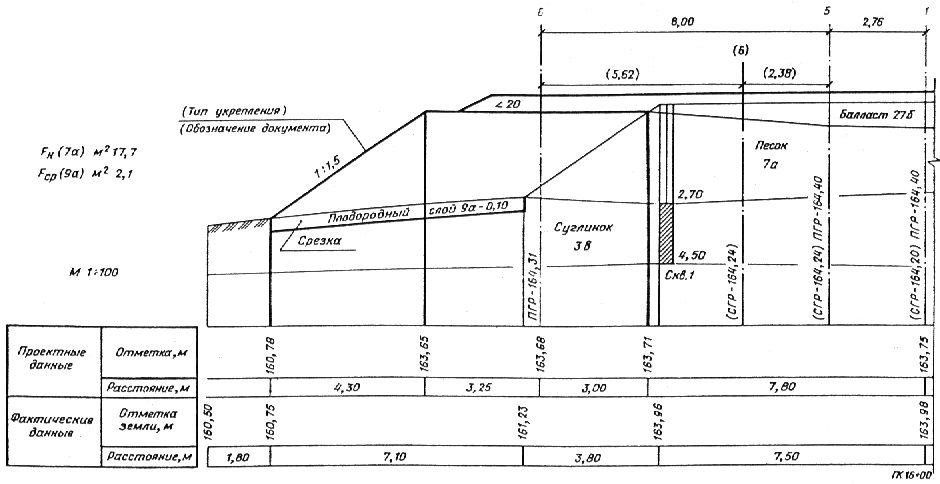 При размещении на листе двух поперечных профилей и более боковик таблицы допускается выполнять только у первого поперечного профиля. 8.2 Поперечные профили железнодорожных путей выполняют по направлению возрастания указателей километров, а для путей на застроенной территории (при отсутствии этих указателей) - в сторону возрастания пикетов. 8.3. На поперечном профиле земляного полотна железнодорожного пути показывают: - линию фактической поверхности земли, линии ординат от точек ее переломов и расстояния между ними; - контур проектируемого земляного полотна и линии ординат от точек его переломов, крутизну откосов. При реконструкции, кроме того, указывают контуры существующего земляного полотна и балластной призмы; - ось и отметку головки рельса проектируемого пути (ПГР). При реконструкции, кроме того, указывают оси и номера существующих путей, отметки головки рельса существующих путей (СГР) (номера разбираемых путей и отметки СГР указывают в скобках), расстояния между осями путей (расстояния между осями разбираемых и новых путей указывают в скобках); - проектные отметки земляного полотна и отметки земли в точках перелома; - разведочные геологические выработки (при их наличии), влажность и консистенцию слоев грунта, отметки горизонта высоких вод с датой замера; - границы слоев грунта, их наименования и номера групп в соответствии с классификацией по трудности разработки. Допускается наименования слоев грунта и номера их групп приводить в ведомости грунтов по форме 9; - контуры срезки плодородного или растительного слоя, удаления торфа и замены непригодного грунта; - крутизну откосов; - элементы укрепления откосов земляного полотна и водоотводных сооружений (схематично), их марки (наименования) и обозначения документации, необходимой для выполнения укрепления.