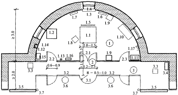 Строго каноничным является лишь отделение алтаря иконостасом, а приведенные варианты объемно-планировочных решений определяются церковно-канонической традицией, функциональными особенностями, конструктивным решением и градостроительной ситуацией размещения храма. Размеры нефов, наличие столбов зависят от строительных материалов и конструкций. Традиционные для православных храмов кирпичные конструкции стен и сводов определяли лимит пролета арок и сводов в пределах 6 - 9 м. Использование в конструкции покрытия монолитного железобетона или металлоконструкции в сочетании с торкретбетоном дает значительно больше возможностей в организации внутреннего пространства храма, в том числе бесстолпного. Наличие столпов в традиционном типе крестово-купольного храма обогащает его пространственную организацию, выделяет центральную, наиболее значимую часть храма, наполняет пространство храма символами. Однако бесстолпные храмы более просторны, в них богослужение могут беспрепятственно созерцать все молящиеся. Здания приходских и монастырских храмов, а также отдельно стоящих храмов, расположенных в общественных комплексах, следует проектировать, как правило, одноэтажными или с цокольным этажом (стилобатом), предназначенным для размещения помещений богослужебного и вспомогательного назначения. Под средней частью храма с цокольным этажом может размещаться алтарь крестильного храма, не имеющий литургического назначения. Кафедральные и монастырские соборы могут быть двухэтажными. При этом над алтарными частями храмов нижнего этажа не должно быть помещений иного назначения, кроме алтаря. Под алтарями храмов верхнего этажа могут располагаться как алтари нижних храмов, так и некоторые помещения вспомогательного назначения, например, ризницы. Домовые церкви и церкви, встроенные в общественные здания учреждений медицинского и социального назначения, учебных заведений и пр. должны размещаться, как правило, на верхних этажах или таким образом, чтобы над алтарем не было помещений иного назначения. Минимальная высота помещений от пола до потолка малых храмов должна составлять не менее 3 м. На хорах, во вспомогательных помещениях и в подвале высота помещений может быть уменьшена до 2,5 м. В домовых церквях вместимостью до 100 человек высота всех частей церкви может быть одинаковой и соответствовать высоте этажа здания, в который встроена домовая церковь. При проектировании объем зданий храмов рекомендуется принимать на одно место вместимости, м3: приходских храмов............................ 4 - 6 соборов............................................... 6 - 8 Примечание. В зависимости от объемнопланировочного решения возможно увеличение или уменьшение указанных величин. Главный вход в храм располагается, как правило, с западной стороны. Дополнительные входы могут быть с южной и северной сторон. В I, II, III климатических районах и IIIг климатическом подрайоне при главном входе следует предусматривать тамбур. При дополнительных входах, служащих в качестве эвакуационных, тамбуры допускается не предусматривать. Ширина тамбуров должна превышать ширину дверного проема не менее чем на 0,15 м с каждой стороны, а глубина тамбуров должна превышать ширину полотна двери не менее чем на 0,2 м. Входы в храмы, проектируемые для строительства в климатических подрайонах IA IБ, IГ, должн