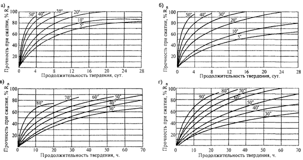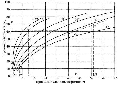 1 - монолитная конструкция; 2 - утеплитель; 3 - пенал из тонкостенной стальной трубки; 4 - индустриальное масло; 5 - термодатчик Рисунок 5 - Установка термодатчика в обогреваемой конструкции 2.8 Не реже двух раз в смену, а в первые три часа с начала обогрева бетона через каждый час, измеряют силу тока и напряжение в питающей цепи. Визуально проверяют отсутствие искрения в местах электрических соединений. 2.9 Прочность бетона обычно проверяют по фактическому температурному режиму. После распалубливания прочность бетона, имеющего положительную температуру, рекомендуется определять с помощью молотка конструкции НИИМосстроя, ультразвуковым способом или высверливанием и испытанием кернов. Набор прочности бетона при различных температурах его выдерживания определяется по графикам, представленным на рисунке 6. а, в - для бетона класса B25 на портландцементе активностью 400 - 500; б, г - для бетона класса В25 на шлакопортландцементе активностью 300 - 400 Рисунок 6 - Кривые набора прочности бетоном при различных температурах его выдерживания 2.10 Ниже приведен пример определения набора прочности бетоном. Пример: Определить прочность бетона в конструкции с Мп = 4 на портландцементе марки 400 при скорости подъема температуры 10 °С в час, температуре изотермического прогрева 70 °С, его продолжительности 12 ч и остывании со скоростью 5 °С в час до конечной температуры 8 °С. Решение: 1 Определить величину относительной прочности за период подъема температуры продолжительность подъема температуры при средней температуре Для этого из точки «А» согласно рисунку 7 проводим перпендикуляр до пересечения с кривой прочности при 40 °С (точка «Б). Величина прочности за время подъема температуры определяется проекцией точки «Б» на ось ординат (точка «В») и составляет 15 %. Определяем прирост относительной прочности при изотермическом прогреве за 12 часов как проекцию участка (точки «Л» и «К») кривой прочности при 70 °С (отрезок «ВЗ»), что составляет 46 % R28. Определяем прирост прочности бетона за 12 часов остывания по кривой прочности при 38 °С как проекцию участка «ЖГ» на ось ординат. Отрезок «ЗИ» соответствует 9 % R28. За весь цикл термообработки бетон приобретает прочность 15 + 46 + 9 = 70 % R28. Для каждого конкретного состава бетона строительной лабораторией должен быть уточнен на опытных образцах-кубах оптимальный режим выдерживания. Рисунок 7 - Пример определения прочности бетона по графику 2.11 Теплоизоляция может быть снята не ранее того момента, когда температура бетона в наружных слоях конструкции достигнет плюс 5 °С и не позже, чем слои остынут до 0 °С. Не допускать примерзания опалубки и теплозащиты к бетону. 2.12 Для предотвращения появления трещин в конструкциях перепад температур между открытой поверхностью бетона и наружным воздухом не должен превышать: - 20 °С для монолитных конструкций с модулем поверхности до 5; - 30 °С для монолитных конструкций с модулем поверхности 5 и выше. В случае невозможности соблюдения указанных условий поверхность бетона после распалубливания должна быть укрыта брезентом, толью, щитами и т.д. 2.13 Раскладку нагревательного провода в конструкцию и электрообогрев бетона нагревательными проводами выполняет звено из 4-х человек согласно таблице 2. Таблица 2 Распределение операций по исполнителям