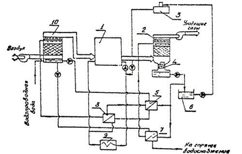 где Vг - расход газа, м3/ч; tв′ и tв″ - соответственно начальная и конечная температуры воды, ºС; Св - теплоемкость воды, кДж/кг · ºС; ηос - коэффициент потерь теплоты в окружающую среду утилизационной установкой. Количество воздуха, нагреваемого в утилизационной установке,