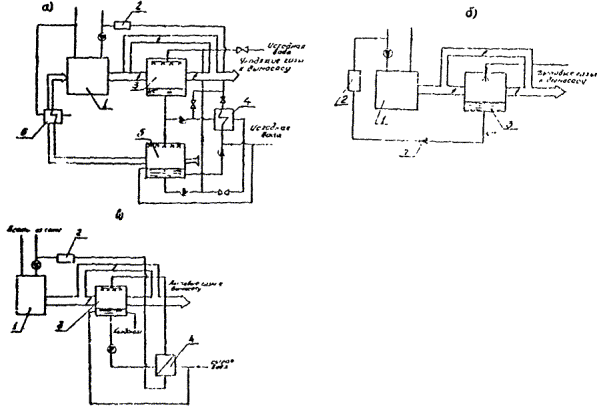 Рис. 6. Схема утилизации теплоты уходящих газов: а - для закрытой тепловой сети; б - для открытой тепловой сети; в - для открытой тепловой сети с использованием промежуточного теплообменника; 1 - водогрейный котел; 2 - оборудование химводоочистки и деаэрации тепловой сети; 3 - контактный охладитель газов; 4 - теплообменник подогрева подпиточной воды; 5 - контактный воздухоподогреватель; 6 - калорифер догрева воздуха; 7 - насос подпиточной воды В случае работы установки без теплообменника 4 сырая вода после скруббера-охладителя газов 3 отбирается из циркуляционного контура и подается непосредственно на химводоочистку (ХВО) и деаэрацию 2 тепловой сети. В летнем режиме воздухоподогреватель отключается вместе с циркуляицонным контуром и насосом циркуляции, а вся подпиточная вода после охлаждения газов из скруббера 3 подается на ХВО и деаэрацию. При максимальной нагрузке, когда выпаривается вода из циркуляционного контура, последний пополняется сырой водой, а при средних нагрузках, когда происходит конденсация водяных паров из продуктов сгорания, они используются для подпитки тепловой сети, что составляет около 6,75 % от расхода подпиточной воды. Утилизация теплоты уходящих газов котла, работающего на открытую систему теплоснабжения, предусматривает подогрев только подпиточной воды. Схема утилизации теплоты дымовых газов для открытой тепловой сети показана на рис. 6, б, где нагрев подпиточной воды осуществляется непосредственно в скруббере и при температуре около 60 ºС подается в ХВО и деаэрацию тепловой сети. При необходимости в циркуляционный контур может быть включен промежуточный теплообменник, в котором нагрев подпиточной воды будет производиться с помощью орошающей воды, т.е. подпиточная вода не будет иметь прямого контакта с продуктами сгорания (рис. 6, в). В схеме для открытой системы теплоснабжения вся подпиточная вода подогревается в контактном охладителе газов до температуры около 30 % и подается на ХВО и деаэрацию. Включение в контур утилизации воздухоподогревателя для открытой тепловой сети нецелесообразно вследствие наличия большого количества воды, достаточного для эффективного охлаждения продуктов сгорания. В случае закрытой системы теплоснабжения ввиду недостаточного количества охлаждающей воды в контур утилизации включен воздухоподогреватель. Опыт работы системы теплоснабжения показал, что при обработке воды на фильтрах в катионитном КУ-2 и вакуумной деаэрацией практически полностью уходят из воды продукты неполного сгорания топлива, растворенные в процессе прохождения воды и газа в контактном экономайзере. Для снижения коррозионных повреждений в дымовой трубе часть газов по байпасной линии перепускается мимо охладителя газов. Утилизационное оборудование разрабатывалось как нестандартное применительно к конкретным объектам. Технико-экономические показатели системы приведены в табл. 8. Таблица 8 Технико-экономические показатели систем утилизации теплоты уходящих газов котла КВГМ-180 [11]