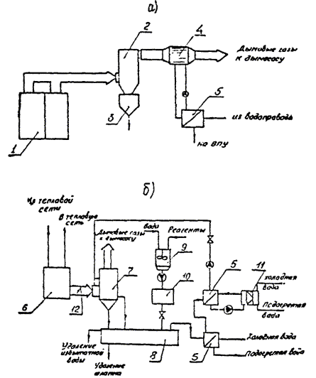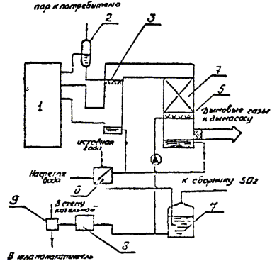 В водогрейных и пароводогрейных котельных, работающих в закрытых системах теплоснабжения, а также в чисто паровых котельных, КТАНы недогружены. Процент недогрузки колеблется в широких пределах в зависимости от условий работы котельной и лежит в пределах от 20 до 70 %. В подобных случаях рекомендуется устанавливать КТАНы меньшего типоразмера, соответствующие имеющейся тепловой нагрузке, или установку КТАНов не за всеми котлами с возможностью переключения с одного котла на другой. Возможные схемы подключения КТАНов по воде представлены на рис. 4. Принципиальная схема котельной с установленным КТАНом и контактным подогревателем дутьевого воздуха приведена на рис. 5. Горячие газы от котла поступают в КТАНы, где подогреваются химочищенная и исходная вода в трубах активной насадки. Охлажденные дымовые газы дымососом направляются в дымовую трубу. Для исключения образования конденсата в дымовой трубе и подводящем борове имеется частичный перепуск газов по обводному газоходу. Подогретая орошающая вода из КТАНа направляется в контактный воздухоподогреватель для подогрева дутьевого воздуха котла. Охлажденная в воздухоподогревателе орошающая вода направляется насосом на орошение в КТАН. Избыток воды за счет конденсации влаги из дымовых газов направляется в сборный бак. По требованиям водоподготовительного цикла котельной подогрев исходной воды перед водоподготовительной установкой производится до 20 °С. В нижней части насадки КТАНа осуществляется подогрев исходной воды от 5 до 20 °С, а в верхней части подогрев химочищенной воды от 20 до 50 °С. В водогрейных котельных, работающих в закрытых системах теплоснабжения, расход теплоты на подогрев подпиточной воды составляет около 30 % от возможной теплопроизводительности КТАНа в среднеотопительном режиме и всего 14-17 % в расчетном режиме. Для этих котельных целесообразна установка воздухоподогревателей для нагрева дутьевого воздуха котлов. Подогрев в расчетном режиме дутьевого воздуха до 30 ºС позволяет использовать около 20 % теплоты, получаемой в КТАНе-утилизаторе. В среднеотопительном режиме этот процент снижается до 15 %. Рис. 4. Схемы включения КТАНов: а - в котельной с централизованной системой горячего водоснабжения; б - в котельной для открытой или закрытой систем теплоснабжения; в - подключение воздухоподогревателя Рис. 5. Принципиальная схема установки КТАНов в котельной: 1 - котел; 2 - контактный воздухоподогреватель; 3 - КТАН; 4 - вентилятор; 5 - дымосос; 6 - насос орошения КТАНа; 7 - насос орошения воздухоподогревателя; 8 - бак орошающей воды; 9 - регулирующий клапан Суммарная нагрузка КТАНов в водогрейных котельных, работающих в закрытых системах теплоснабжения, составляет 35-50 % от возможной теплопроизводительности в зависимости от режима работы котельной. В котельных, работающих в закрытых системах теплоснабжения, часть утилизированного тепла может быть использована для подогрева обратной сетевой воды в системе теплоснабжения. Однако в КТАНах подогрев обратной сетевой воды нецелесообразен, так как в течение отопительного сезона температура ее выше или сравнима с максимально возможной температурой подогрева воды в КТАНе. Разработанный типоряд КТАНов позволяет использовать эту конструкцию в широком диапазоне мощностей за котлами теплопроизводительностью 0,23-116,3 МВт, но эта 