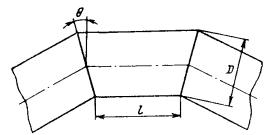 6. Схема секторного отвода Номинальный наружный диаметр принимается равным его значению на концах колена (в местах присоединения колена к другим деталям трубопроводов). 2.3.4. Допускается применение штампосварных колен, изготовленных из двух заготовок, сваренных двумя продольными швами или кольцевым швом, при соблюдении требований п. 2.3.3. 2.3.5. Применение сварных секторных отводов, сварных тройников и переходов допускается для трубопроводов группы В с рабочим давлением до 1,57 МПа (16 кгс/см2) и расчетной температурой до 100 °С, а также для трубопроводов группы С с рабочим давлением до 3,9 МПа (40кгс/см2) и расчетной температурой до 350°С. В сварных секторных отводах угол q должен быть не более 15°, расстояние l - не менее 100 мм (рис. 6). 2.3.6. Расположение отверстий на прямых участках трубопроводов должно удовлетворять требованиям п. 2.2.3. Расположение отверстий на криволинейных участках колен не допускается, за исключением отверстий диаметром, не более 0,1 номинального наружного диаметра колена, но не более 20 мм для приварки штуцеров, труб и бобышек систем контрольно-измерительных устройств в количестве, не более одного отверстия на колено. 2.3.7. В нижних точках каждого отключаемого задвижками участка трубопровода, не имеющего естественного стока за счет уклона, следует предусматривать устройства для дренажа трубопровода. Для трубопроводов с номинальным наружным диаметром до 89 мм, изготовленных из коррозионно-стойких сталей аустенитного класса, указанное требование не является обязательным. Устройство дренажей должно обеспечивать возможность проверки исправности их состояния. 2.3.8. В верхних точках трубопроводов (при отсутствии возможности удаления воздуха через оборудование) для отвода воздуха должны устанавливаться воздушники. На трубопроводах, работающих под вакуумом, воздушники допускается не устанавливать при наличии возможности удаления воздуха при гидравлических испытаниях другим способом. 2.3.9. На дренажных трубопроводах и линиях воздушников контуров с радиоактивным теплоносителем должны устанавливаться два запорных органа, причем для воздушников допускается устанавливать один дроссельный и один запорный орган. Допускается объединение линий отвода воздуха и линий дренажа в общий трубопровод после первых запорных органов с установкой на нем общего запорного органа. Линии отвода воздуха из неотключаемых друг от друга участков оборудования или трубопроводов допускается объединять после дроссельных вентилей. 2.3.10. Все участки паропроводов, которые могут быть отключены запорными органами, для возможности прогрева и продувки должны быть снабжены в концевых точках штуцером с вентилем, а при рабочем давлении свыше 2,15 МПа (22 кгс/см2) и на паропроводах систем группы В независимо от давления - штуцером и двумя последовательно расположенными вентилями - запорным и дроссельным. В случае прогрева участка паропровода в двух направлениях должна быть предусмотрена продувка с каждого конца участка. 2.3.11. Горизонтальные участки трубопроводов должны иметь уклон не менее 0,004 в сторону организованного дренажа. Для паропроводов указанный уклон должен сохраняться при температуре, равной температуре насыщения пара при рабочем давлении. На горизонтальных участках трубопроводов с номинальным наружным диаметром до 60 мм из коррозионно-сто