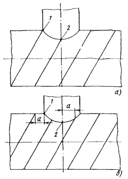 Рис. 17. Вварка штуцеров в трубопроводы со спиральными швами: а - не допускается; б - допускается; 1,2 - угловые точки пересечения образующих штуцера и трубопроводов (а ³ 100 мм) 2.4.3.15. При вварке патрубков (штуцеров) в трубопроводы из труб с продольными или спиральными швами не допускается выход сварных швов труб в угловые (верхние и нижние) точки пересечения образующих трубы и штуцера. Измеряемое на наружной поверхности минимальное расстояние от указанных точек до осей сварных швов труб должно быть не менее 100 мм (рис. 17). При приварке накладок под опоры и подвески к трубопроводам из труб со спиральными швами минимальное расстояние между краем углового шва приварки накладки и краем стыкового спирального шва трубы должно быть не менее трех номинальных толщин стенки трубы. 2.5. СПЕЦИАЛЬНЫЕ ТРЕБОВАНИЯ К ОБОРУДОВАНИЮ И ТРУБОПРОВОДАМ АЭУ С РЕАКТОРАМИ НА БЫСТРЫХ НЕЙТРОНАХ С ЖИДКОМЕТАЛЛИЧЕСКИМ ТЕПЛОНОСИТЕЛЕМ2.5.1. На оборудование и трубопроводы АЭУ с реакторами на быстрых нейтронах с жидкометаллическим теплоносителем распространяются все требования п. 2.1 - 2.4, а также требования, изложенные в настоящем пункте. 2.5.2. Корпус реактора и примыкающие к нему трубопроводы первого контура с жидкометаллическим теплоносителем должны быть заключены в страховочные корпуса (кожухи) до максимально возможного уровня теплоносителя (с учетом повышения уровня при эксплуатации) в корпусе реактора. На трубопроводах страховочные кожухи следует выполнять до запорной (отсечной) арматуры включительно. Угловые сварные швы приварки страховочных корпусов (кожухов) к оборудованию и трубопроводам допускается выполнять с конструкционным зазором. Необходимость установки страховочных кожухов за первой запорной арматурой, дополнительной арматуры и т.п. определяется конструкторской организацией в соответствии с требованиями ОПБ-88. Присоединение патрубков вспомогательных трубопроводов к страховочному корпусу ниже уровня теплоносителя по первому контуру допускается при условии их демонтажа и глушения патрубков на страховочном корпусе после заполнения реактора теплоносителем. 2.5.4. Устройство люков в пределах зоны, заполняемой жидкометаллическим теплоносителем до максимально возможного уровня, не допускается. 2.5.5. Приварка трубопроводов с номинальным наружным диаметром более 300 мм к корпусу реактора или страховочному корпусу должна выполняться стыковым сварным швом к отбортованной части корпуса. 2.5.6. При изготовлении страховочных корпусов (кожухов) допускается применение секторных отводов и сварных переходов. 2.5.7. При проектировании оборудования с жидкометаллическим теплоносителем должны предусматриваться меры по поддержанию температуры теплоносителя выше температуры его затвердевания (для натрия рекомендуется минимальная температура разогрева, равная 200 °С). С этой целью все оборудование и трубопроводы, постоянно или периодически заполняемые жидкометаллическим теплоносителем или его парами, должны оснащаться системой электрического или газового обогрева и приборами для контроля и регулирования температуры. Системы электрического обогрева и температурного контроля оборудования и трубопроводов первого контура должны иметь необходимое резервирование. 2.5.8. Оборудование и трубопроводы с жидкометаллическим теплоносителем должны иметь систе