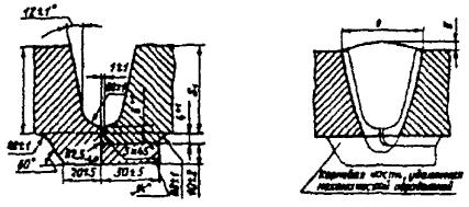 выполнения сварных соединений деталей из двухслойных сталей: 6.4.5. Разделительную наплавку следует выполнять покрытыми электродами марок ЦЛ-25/1 или ЗИО-8, сварочной проволокой марки Св-07Х25Н13 (при аргонодуговой наплавке), сварочной лентой марки Св-07Х25Н13 в сочетании с флюсом марки ОФ-10 или сварочной лентой марки Св-04Х20Н10Г2Б в сочетании с флюсом марки ФЦ-18 (при автоматической наплавке под флюсом). При этом размеры элементов сварного соединения должны соответствовать указанным на рис. 1. В случае предусмотренного конструкторской документацией снятия усиления сварного шва размеры усиления, указанные на рис. 1, устанавливаются конструкторской организацией по согласованию с головной материаловедческой организацией. · в случае, если сварное соединение не подлежит термической обработке - сварочными материалами по п. 6.4.5 или покрытыми электродами марок ЭА-400/10У, ЭА-400/10Т, ЦТ-26, ЦТ-26М, ЭА-898/21Б, ЦТ-15К, ЦЛ-25/2, или сварочной проволокой марок Св-04Х19Н11М3, Св-04Х20Н10Г2Б, Св-08Х19Н10Г2Б (при аргонодуговой наплавке), или сварочной лентой марок Св-04Х19Н11М3, Св-04Х20Н10Г2Б, Св-08Х19Н10Г2Б в сочетании с флюсом марок ОФ-10 или ФЦ-18 (при автоматической наплавке под флюсом); · в случае, если сварное соединение подлежит термической обработке - покрытыми электродами марок ЭА-898/21Б или ЦТ-15К, или сварочной проволокой марок Св-04Х20Н10Г2Б или Св-08Х19Н10Г2Б (при аргонодуговой наплавке), или сварочной лентой марок Св-04Х20Н10Г2Б или Св-08Х19Н10Г2Б в сочетании с флюсом марок ОФ-10 или ФЦ-18 (при автоматической наплавке под флюсом). В случаях, предусмотренных ПТД, допускается выполнение защитной наплавки сварочной лентой марки Св-04Х20Н10Г2Б в один слой. 6.4.7. Защитную и разделительную наплавки ручной дуговой сваркой покрытыми электродами следует выполнять отдельными продольными валиками шириной не более трех диаметров стержня применяемого электрода. В случаях, предусмотренных ПТД, допускается увеличение ширины валиков разделительной наплавки до четырех диаметров электродного стержня. 6.4.8. Сварку деталей с номинальной толщиной основного слоя (для угловых и тавровых сварных соединений - с расчетной высотой углового шва) из углеродистых и кремнемарганцовистых сталей до 10 мм включительно и из легированных сталей до 6 мм включительно допускается выполнять покрытыми электродами марок ЭА-855/51 или ЦТ-45, или сварочной проволокой марок Св-03Х15Н35Г7М6Б или Св-03Х20Н45М6Г6Б-ВИ (при аргонодуговой сварке) на всю толщину с любой стороны без удаления плакирующего слоя. Если металл плакирующего слоя не содержит ниобий и сварное соединение не подлежит термической обработке, выполнение сварки основного слоя допускается покрытыми электродами марок ЭА-395/9 или ЦТ-10, или сварочной проволокой марки Св-10Х16Н25АМ6 (при аргонодуговой сварке) до уровня, перекрывающего плакирующий слой не менее чем на 1 мм, а разделительной и защитной наплавок - покрытыми электродами марок ЭА-400/10У, ЭА-400/10Т, ЦТ-26, ЦТ-26М или сварочной проволокой марки Св-04Х19Н11М3 (при аргонодуговой наплавке) не менее чем в два слоя. 6.4.9. Односторонние сварные соединения, не доступные для сварки со стороны плакирующего слоя, допускается выполнять без удаления плакирующего слоя с предварительной наплавкой кромок согласно рис. 2 и 3. Рис. 2. Схема выполнения