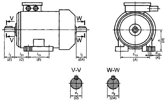 Концы валов цилиндрические d1(DA) ×l1(EA) мм, при числе полюсов 2р |