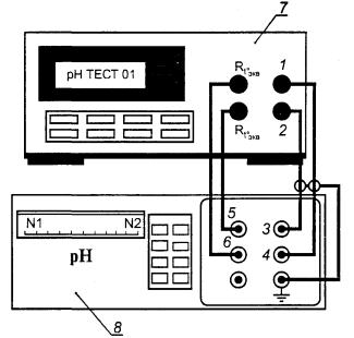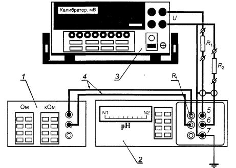 где U0 - измеренное напряжение при дополнительном сопротивлении R1 = 0 ГОм в цепи измерительного электрода, мВ; U1 - измеренное напряжение при дополнительном сопротивлении R1 = 0,5 ГОм в цепи измерительного электрода, мВ. 9.6.2.5 Если значения dизм, рассчитанные для каждой из отметок N1 и N2, не превышают пределов, указанных в ЭД, прибор признают пригодным к проведению дальнейшей поверки. В противном случае прибор бракуют. 9.6.3 Погрешность ИП, связанную с изменением сопротивления электрода сравнения (вспомогательного электрода), определяют по следующей методике. 9.6.3.2 Устанавливают дополнительное сопротивление R2 цепи электрода сравнения (вспомогательного электрода), равное 20 кОм, и далее проводят операции по 9.6.3.1. 9.6.3.3 Напряжение U0 измеряют следующим образом. Устанавливают дополнительное сопротивление R2, равное 10 кОм, и далее проводят операции по 9.6.3.1. 9.6.3.4 Предел dизм дополнительной допускаемой погрешности измерения рН (рХ), связанной с изменением сопротивления электрода сравнения (вспомогательного электрода), рассчитывают для каждой отметки шкалы N1 и N2 и каждого значения R2 по формуле где U0 - напряжение компаратора, измеренное при сопротивлении R2 = 10 кОм, мВ; U1 - напряжение компаратора, измеренное при R2, равном 0 кОм или 20 кОм, мВ. 9.6.3.5 Если значения dизм, рассчитанные по формуле (5) для каждой отметки N1 и N2 шкалы ИП прибора и каждого значения R2, не превышают пределов, указанных в ЭД, прибор признают пригодным к дальнейшему проведению поверки. В противном случае прибор бракуют. 10 Оформление результатов поверки10.1 Положительные результаты поверки оформляют путем нанесения оттиска поверительного клейма на прибор и (или) в ЭД в соответствии с ПР 50.2.007 [6] и (или) выдачи свидетельства о поверке в соответствии с ПР 50.2.006 [5]. 10.2 При отрицательных результатах поверки выдают извещение о непригодности по ПР 50.2.006 [5] с указанием причин непригодности или делают соответствующую запись в ЭД на прибор. 10.3 При калибровке рН-метров и ионометров оформляют сертификат о калибровке по форме приложения 2 ПР 50.2.016 [1], также делают запись в ЭД при необходимости. По требованию заказчика на обороте сертификата приводят фактические значения погрешностей калибруемого прибора. ПРИЛОЖЕНИЕ А(обязательное) 1 - термостат водяной; 2 - термометр эталонный; 3 - стакан с буферным раствором - рабочим эталоном рН (аттестованной смесью); 4 - электрод сравнения (вспомогательный электрод) из состава прибора; 5 - измерительный (стеклянный или ионоселективный) электрод из состава прибора; 6 - измерительный преобразователь из состава прибора; 7 - термокомпенсатор с соединительным кабелем. Примечание - Вместо измерительных и вспомогательных электродов могут использоваться комбинированные электроды. Рисунок А.1 - Схема установки для поверки прибораПРИЛОЖЕНИЕ Б(обязательное) Установка для определения пределов дополнительной допускаемой погрешности по 9.6 настоящих рекомендаций1 - магазин сопротивлений; 2 - ИП; 3 - калибратор напряжения; 4 - соединительные провода и входные соединители (Rt) цепи термокомпенсатора прибора; 5 - входной соединитель цепи измерительного (стеклянного) электрода; 6 - входной соединитель цепи электрода сравнения (вспомогательного электрода); 7 - входной соединитель цепи заземления ИП; R1 и R2 - дополнительные сопротивления (имитаторы электродной системы прибора); N1 и N2 - начальная и кон