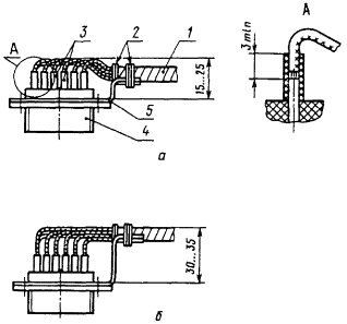 (Измененная редакция, Изм. № 1). 8. Если в одно отверстие контакта соединителя необходимо впаять несколько проводов меньшего сечения, то жилы всех проводов должны быть скручены вместе, а суммарный диаметр облуженных проводов должен быть меньше диаметра соответствующего отверстия в контакте соединителя. 9. Длина паяной части провода, входящего в отверстие крепежной части контакта, должна быть равна длине монтажной части внутренней полости контакта и соответствовать указанной в таблице и на черт. 1-2. 1 - припой; 2 - жила; 3 - изоляционная трубка; 4 - провод; 5 - соединитель Черт. 1 Черт. 2 (Измененная редакция, Изм. № 2). 10. При монтаже соединителей не допускается применять провода, у которых наружный диаметр по изоляции вместе с надеваемой на провод изоляционной трубкой больше, чем расстояние между осями контактов в соединителе. 11. Резервные контакты в соединителе необходимо запаять отрезками проводов одной из марок, которыми производится монтаж. Рекомендуемая длина проводов 40 - 100 мм. 12. Резервные контакты не следует запаивать в соединителях, заливаемых герметиком или работающих непродолжительное время (до 15 мин разового действия) при воздействии вибрации, соответствующей техническим условиям на соединители. 13. Концы резервных проводов следует заделать в общий жгут в соответствии с черт. 3-6. 14. Монтаж проводов с полиэтиленовой и фторопластовой изоляцией в соединители должен соответствовать: черт. 7а - если общая высота кронштейна и диаметра жгута не превышает 15 мм; черт. 7б - если общая высота кронштейна и диаметра жгута превышает 15 мм. При отсутствии кронштейна учитывают только диаметр жгута. (Измененная редакция, Изм. № 1). 15. Высота укладки проводов с поливинилхлоридной изоляцией площадью сечения 0,20 мм2 от основания корпуса соединителя не должна быть более 25 мм. 16. Провода, заделываемые в соединители, должны быть закреплены у корпуса соединителя с применением кронштейнов или на панели. 17. Рихтовка проводов после пайки не допускается. 18. Перемычки в соединителе, выполненные монтажным проводом, следует выводить петлей в жгут. Петли перемычек следует располагать ступенчато. Длина петли в этом случае не должна превышать 100 мм от крепления жгута у соединителя. Необходимость введения перемычек петлей в жгут определяет разработчик конструкторской документации. (Измененная редакция, Изм. № 2). 19. Перемычки выполняются в соответствии с черт. 8 только при заливке соединителей компаундом или герметиком. При этом петли должны быть минимального размера, позволяющего на контакты соединителя надеть изоляционные трубки. 1 - жгут; 2 - изоляционная лента; 3 - резервные провода Черт. 3