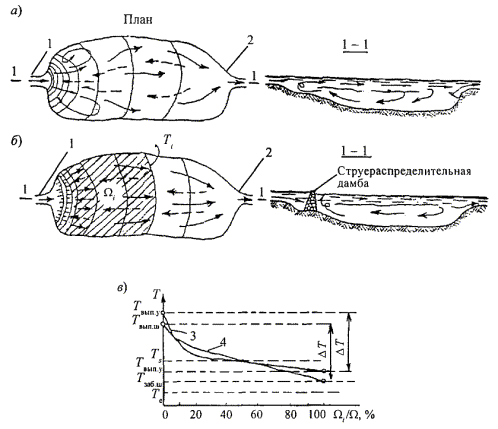При выпуске подогретой циркуляционной воды в водоем-охладитель должна быть обеспечена равномерность распределения скоростей воды по всему водовыпускному фронту. Для этой цели может быть применена фильтрующая струераспределительная дамба, длина которой определяется по формуле (4.4):