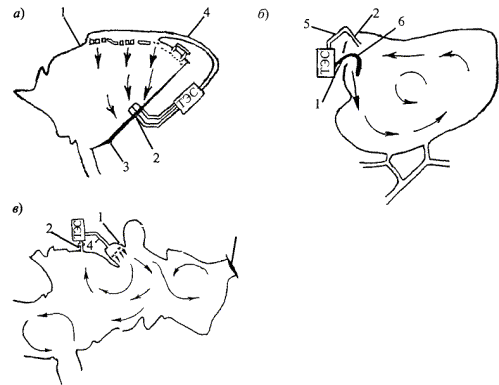 Рис. 3. Схемы использования вытянутых широких водоемов-охладителей (0,2 < B/L < 0,5): а - тип II.1; б - тип II.2; в - тип II.3; 1 - водовыпускное сооружение; 2 - водозаборное сооружение; 3 - плотина; 4 - отводящий канал; 5 - подводящий канал; 6 - струенаправляющее сооружение