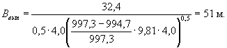 Перегрев на водозаборе определяется по номограмме, приведенной на рис. 6, δТ = 4,3 °С, откуда Тзаб = Тр + δТ = 19,8 + 4,3 = 24,1 °С; Твып = Тзаб + DТ = 24,1 + 9,0 = 33,1 °С. Среднеповерхностная температура водоема-охладителя Тs = Тзаб + ПТDТ = 24,1 + 0,25 · 9,0 = 26,4 °С. Определение геометрических параметров водовыпускного сооружения Из табл. I.2 приложения I определяются значения плотности воды, соответствующие температурам Твып, Тзаб и Тs, которые равны 994,7; 997,3 и 996,7 кг/м3 соответственно. По формуле (2.1) вычисляется параметр стратификации