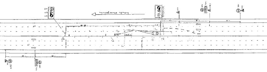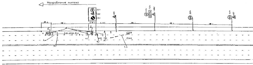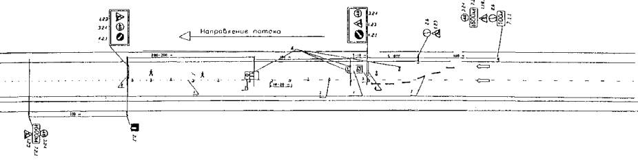 Рис. 8. Нанесение линий рядности по существующей разметке (обновление) 1 - предварительная разметка; 2 - сигнальные фишки (конуса) со светоотражающей поверхностью; 3 - машина прикрытия; 4 - импульсная стрелка (d 900; 1200); 5 - направление объезда транспорта; 6 - сигнальный фонарь. Примечания: 1). Дорожные знаки на стойках следует располагать на высоте не менее 2 м; дорожные знаки на временном ограждении следует располагать на высоте не менее 0,6 м. 2). Дорожные знаки 3.24 поэтапно (с шагом 20 км/час) ограничения скорости устанавливают последовательно на расстоянии 100 м друг от друга. 3). При производстве разметочных работ на основной проезжей части МКАД ограничение максимальной скорости на участке разметки устанавливают не ниже 60 км/час. 4). Зона действия знака 7.2.1 определяется длиной участка разметки. 5). Протяженность зоны изменения направления движения Lomz определяется с учетом скорости на подходе (Lomz =50 м при скорости до 40 км/час; Lomz =75 м при скорости до 60 км/час для перекрываемой проезжей части шириной 4 м). 6). Подрядная организация информирует службу ГИБДД о начале работ. 7). Работы проводятся только при наличии технических средств регулирования дорожного движения и схемы разметки, согласованной с ГИБДД. Приложение 2.9