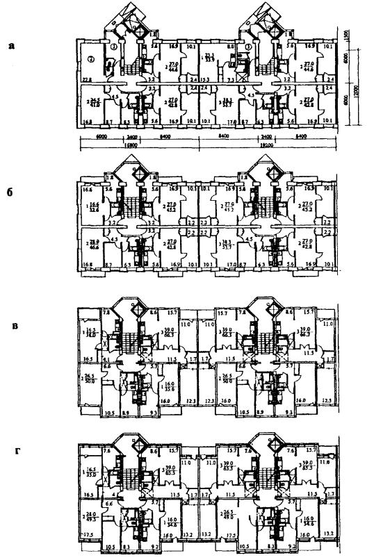 Примеры планировочных решений секционных жилых домов с лестницами различных типов приведены на рис. 21 и 22.