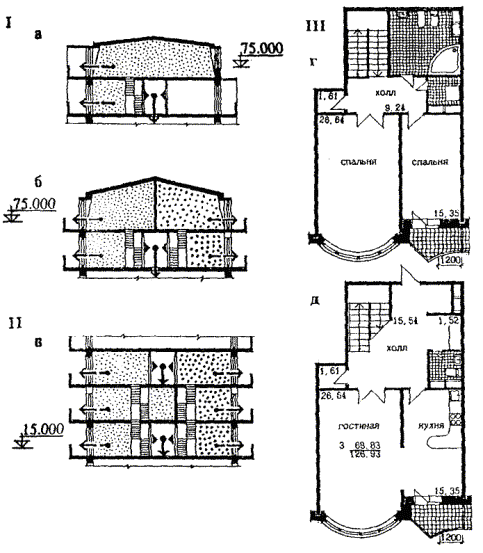 Рис. 9. Примеры планировочно шумозащищенных решений в жилых зданиях. I - Т-образная 10-квартирная секция для застройки южной стороны магистрали: а - план типового этажа; II - 2-квартирная секция неограниченной ориентации (МНИИТЭП, М4. Архитекторы: В. Датюк, Р. Богуславский): б - план типового этажа; III - коридорный жилой дом неограниченной ориентации: в - план типового этажа; г - планы двухэтажных 3-комнатных квартир (МНИИТЭП, М4, проектное предложение. Архитектор Г. Бочаров). 3.10. [3.1]. Террасные жилые дома в Москве могут проектироваться для территорий с выраженным рельефом, а также и при его отсутствии - для участков плотной застройки в условиях недостаточной инсоляции и естественной освещенности. Ступенчатое построение объема (по одной или нескольким сторонам) этих зданий может быть достигнуто за счет уменьшения: глубины комнат по торцам здания или по его фронту; числа комнат в квартире; количества квартир на этаже; этажей в смежных секциях. Для территорий на рельефе, как правило, применяются дома со ступенчатым построением объема как вдоль протяженного фасада, так и поперек торцевой части здания. Для условий плоского рельефа допускается применение домов с террасированным построением объема по всем сторонам здания. Террасные жилые дома могут проектироваться блокированными, секционными (рис. 10б - в), коридорными (рис. 10а), а также могут иметь смешанную планировочную структуру (табл. 8). Таблица 8 ТЕРРАСНЫЕ ЖИЛЫЕ ДОМА