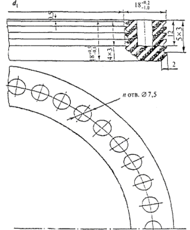 3.2.4 Трубы должны быть прямолинейными, отклонение от прямолинейности не должно превышать 12 мм для труб длиной 3950 мм и 18 мм - для труб длиной 5000 мм. 3.2.5 Трубы и муфты должны быть водонепроницаемыми. При испытании гидравлическим давлением 3,0 МПа на наружной поверхности не должно быть признаков проникновения воды. 3.2.6 Трубы должны выдерживать без разрушения нагрузку от гидравлического давления 4,4; 4,1; 3,9 и 3,4 МПа для труб условным проходом соответственно 100; 125 - 150; 200 и 250 - 500 мм. 3.2.7 Образцы труб должны выдерживать при испытаниях на раздавливание нагрузку не менее 18, 20, 24, 26, 30 и 39 кН для труб условным проходом соответственно 200, 250, 300, 400 и 500 мм. 3.2.8 Для уплотнения соединений труб с муфтами должны использоваться резиновые кольца (рисунок 2) с размерами, приведенными в таблице 3. d1 - внутренний диаметр кольца, мм; п - число гнезд в стенке кольца Рисунок 2 - Уплотняющее кольцо фигурного сечения для муфты САМ Таблица 3 - Резиновые кольца фигурного сечения для муфт Размеры в миллиметрах