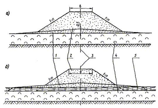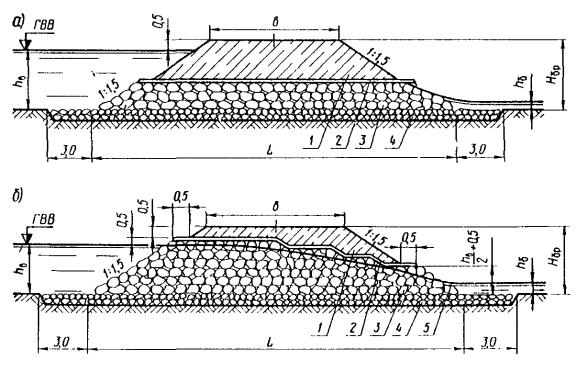 где g - объемный вес амортизирующей отсыпки, т/м3; х - глубина проникания, м; j - угол внутреннего трения амортизирующей отсыпки, град; F - площадь диаметрального сечения камня условной шаровой формы, м2. Проверка на удар производится в предположении свежеотсыпанной амортизирующей засыпки с углом внутреннего трения грунта j = 40°. Влияние ударной силы на сооружение следует рассчитывать с учетом распределения сил в упругой среде и угла наклона амортизирующей отсыпки. Для участков, где по достаточно точным сведениям ожидается падение камней объемом меньше 1 м3, разрешается вести расчет по среднемаксимальному фактическому объему падающих камней. При расчете на удар статическое давление амортизирующей отсыпки можно не учитывать, а допускаемые напряжения в кладке и на грунт увеличивать на 20 %. При проверке устойчивости сооружения на скольжение и опрокидывание с учетом динамической нагрузки коэффициент запаса можно принимать равным 1,2. Приложение 13Гидравлический расчет фильтрующих насыпейНапорные фильтрующие насыпи 1. В зависимости от высоты земляного полотна, грунта основания и рельефа местности назначается допускаемая глубина воды перед фильтрующей насыпью (рис. 1), исходя из условий hв £ Hбр - 0,5; (1) hв £ где Hбр - высота насыпи до бровки с нагорной стороны полотна, м; L - длина фильтрующей насыпи понизу, м; С - коэффициент устойчивости основания (табл. 1). Рис. 1. Продольный разрез фильтрующих насыпей: а - напорных; б - безнапорных; 1 - земляное полотно; 2 - изоляционный слой; 3 - фильтрующая часть насыпи; 4 - укрепление основания; 5 - кривая депрессии Дли дальнейшего расчета принимается наименьшее значение hв из двух величин, определенных по условиям (1) и (2). Таблица 1