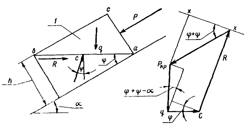 предельную высоту устойчивого вертикального откоса где b - угол наклона поверхностей ослабления к горизонту, град; ρтр - угол внутреннего трения по контактам поверхностей ослабления, град, принимаемый по результатам испытаний или по табл. 3. Рис. 2. График зависимости коэффициента а от сцепления породы в образце 3. При неблагоприятном расположении поверхностей ослабления (рис. 3, а) предельная высота Hпр устойчивого откоса различной крутизны определяется по формуле где a - угол наклона проектируемого откоса, град. 4. При неблагоприятном расположении поверхностей ослабления (b > ρтр) и совпадении угла наклона откоса с углом наклона поверхностей ослабления (a = b, Рис. 3, б) предельная высота устойчивого откоса Hпр определяется по формулам: Рис. 3. Расчетная схема наклонного откоса при неблагоприятном расположении плоскостей ослабления: а - поверхность проектируемого откоса с поверхностями ослабления не совпадает; б - совпадает; 1 - контур вероятной поверхности скольжения Таблица 2
