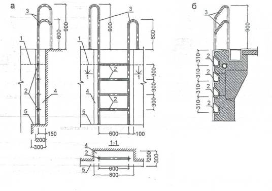 а – металлическая лестница; б – керамическая лестница; 1 – уровень воды; 2 – ступени; 3 – разновысокие поручни; 4 – ниша; 5 – уступ для отдыха