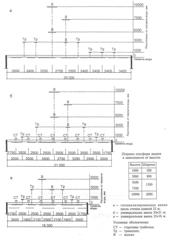 а – 25-метровая ванна для спортивного плавания с двусторонним продольным уклоном; б – то же, с односторонним продольным уклоном; в - то же, с двусторонним поперечным уклоном; г - 25-метровая универсальная ванна с вышкой для прыжков высотой 5 м; д - 50-метровая ванна для спортивного плавания с двусторонним продольным уклоном; е - то же, с односторонним продольным уклоном; ж - то же, с двусторонним поперечным уклоном; з - 50-метровая универсальная ванна с вышкой для прыжков высотой 10 м