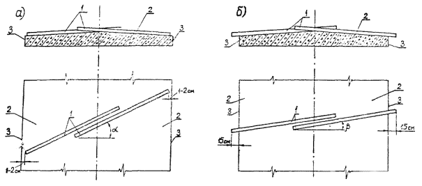 Положение брусьев при работе бетоновыглаживающей машины ТFВ-280 а) при предварительной отделке поверхности покрытия; б) при окончательной отделке; 1 - выглаживающие брусья; 2 - цементобетонное покрытие; 3 - кромка покрытия; a - угол наклона брусьев при предварительной отделке; b - угол наклона брусьев при окончательной отделке Два бруса, проходя по поверхности покрытия, срезают излишки растворной части с поверхности покрытия и перемещают их в пониженные участки и к краю цементобетонного покрытия. Предварительную отделку осуществляют небольшими участками. Длина таких участков зависит от скорости твердения бетона, температуры воздуха и скорости ветра и в каждом конкретном случае будет различна (приблизительно от 10 до 30 м). В некоторых случаях во время первого прохода машины поверхность покрытия орошают водой с помощью установленной на машине системы орошения. Количество проходов машины по одному участку покрытия при предварительной отделке определяют в зависимости от количества и величины неровностей покрытия. Окончательная отделка поверхности бетонного покрытия После окончания предварительной отделки машину возвращают к началу участка и начинают подготовку ее к окончательной отделке. Для этого поднимают брусья и изменяют угловое их положение так, чтобы внешние концы брусьев заходили за кромки покрытия на 15 см (см. рисунок). После чего придают брусьям очертание поперечника дороги. Опускают холстовую щетку на поверхность покрытия и включают среднюю скорость машины. Во время движения машины опускают брусья в рабочее положение, после чего переводят машину на повышенную скорость. Так как брусья своими внешними концами выходят за кромки покрытия, то при движении машины излишки растворной части удаляются за пределы покрытия. Плавающая холстовая щетка, перемещаясь по поверхности покрытия, создает однородную матовую текстуру поверхности покрытия, подготавливая ее для нанесения пленкообразующего материала. В случае необходимости холстовую щетку смачивают водой при помощи системы орошения. Создание шероховатости на поверхности бетонного покрытия Сразу же по завершении окончательной отделки поверхности машиной ТFВ-280 осуществляют текстурирование поверхности покрытия - создание шероховатости поперечной щеткой двухполосного финишера ТС-280. Поперечная щетка установлена в двойных направляющих снизу главной рамы и перемещается поперек бетонируемой полосы. Перед началом работ по созданию шероховатости на поверхности покрытия необходимо проверить прямолинейность направляющих, по которым перемещается щетка, и придать направляющим очертание поперечного профиля покрытия. После чего щетку устанавливают так, чтобы она отстояла от левой кромки покрытия на 1 - 2 см. С помощью «правого» и «левого» выключателей опускают ее на поверхность покрытия и приступают к созданию шероховатости. Во время движения машины, пользуясь выключателем «ход щетки вправо - влево» перемещают щетку поперек бетонируемой полосы, создавая шероховатость на поверхности покрытия. При достижении щеткой противоположной стороны (правой или левой) срабатывает реверсивный выключатель и щетка возвращается в исходное положение. Создание шероховатости на поверхности свежеуложенного бетонного покрытия осуществляют за один проход двухполосного финишера 