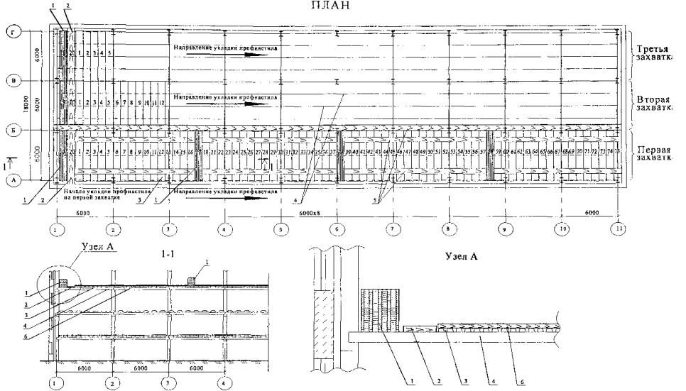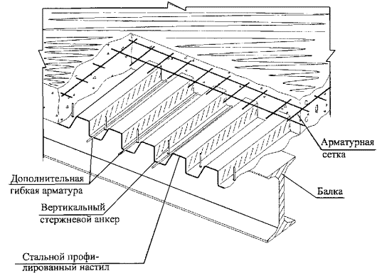 1.5 При использовании технологической карты необходима ее привязка к конкретным условиям строительной площадки. 2. ОРГАНИЗАЦИЯ И ТЕХНОЛОГИЯ ВЫПОЛНЕНИЯ РАБОТ2.1 Работы по устройству монолитных перекрытий с применением стального профилированного настила осуществляются в соответствии с рабочими чертежами, проектом производства работ, а также с соблюдением требований СНиП 3.01.01-85* «Организация строительного производства», СНиП 3.03.01-87 «Несущие и ограждающие конструкции», «Рекомендаций по проектированию монолитных железобетонных перекрытий со стальным профилированным настилом» НИИЖБ. 2.2 До начала производства работ по устройству монолитного перекрытия должны быть выполнены подготовительные работы, предусмотренные ППР, в том числе: - закончен монтаж металлических балок и прогонов перекрытий; - подготовлены механизмы, приспособления и оборудование; - осуществлена раскладка пакетов профилированного настила, арматуры (сеток и каркасов) в объеме, определенном ППР на захватку; - произведена разметка мест установки настилов и стоек для крепления торцевой опалубки; - установлены поддерживающие леса с подмостями и ограждениями. 2.3 Подбор настилов по профилю и размерам для объекта в целом необходимо производить с одного завода-изготовителя. 2.4 На строительную площадку стальные профили должны поставляться пакетами. Пакеты при транспортировании и хранении должны быть уложены на деревянные или из другого материала прокладки одинаковой толщины не менее 50 мм, шириной не менее 150 мм и длиной больше габаритного размера пакета не менее чем на 100 мм, расположенные не реже чем через 3 м. При транспортировании и хранении пакеты должны быть размещены в один ярус. 2.5 Длину пролета плиты рекомендуется назначать в пределах 1,5 - 3 м. Допускается принимать большие пролеты при устройстве временных опор на период бетонирования и вызревания бетона. 2.6 Листы крепятся к стальным прогонам точечной сваркой с принудительным проплавлением и формованием электрозаклепки с использованием штучных стандартных покрытых электродов или самонарезающими винтами, а к железобетонным балкам перекрытия - с помощью дюбелей. Между собой профнастил крепится комбинированными заклепками. Точки крепления профнастила к прогонам и балкам устанавливаются рабочими чертежами. 2.7 Стальной профилированный настил, используемый в качестве опалубки и арматуры плиты, должен иметь надежное сцепление с бетоном, что обеспечивается выштампованными при прокате рифами и специальными анкерными устройствами. В качестве анкерных устройств рекомендуются вертикальные стержневые анкеры из арматурной стали, привариваемые в процессе монтажа через лист настила к верхней полке стального прогона. Вертикальные стержневые анкеры привариваются по всем прогонам, служащим опорами стального профилированного настила в количестве, определенном проектом. Если совместная работа прогонов с плитой не учитывается, то число анкеров определяется из расчета плиты и принимается не менее одного в каждом гофре по концам профилированного настила и не менее одного через два гофра на промежуточных опорах при непрерывности на них настила. Расстояние от анкера до профнастила и грани прогона должно быть не менее 1,5 диаметра анкера, а между осями анкеров в одном гофре - не менее 70 мм. Длину анкеров следует п
