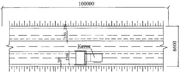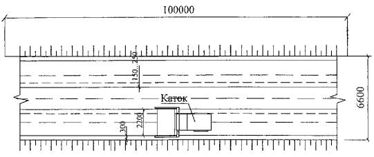 5.2 Расход эксплуатационных материалов для обслуживания машин и механизмов определяется по паспортным данным механизмов. 6. ТЕХНИКО-ЭКОНОМИЧЕСКИЕ ПОКАЗАТЕЛИ6.1 Технико-экономические показатели в технологической карте определены для уплотнения грунта насыпи с откосами 1:1 самоходным катком комбинированного действия ДУ-62А, по рисунку 4 при геометрических размерах участка 100,0´6,6 м. Рисунок 4 - Пример геометрии участка уплотнения для цифровых расчетов Состав звеньев (бригад) по профессиям и распределение работ между ними приводится в таблице 7. Таблица 7 - Состав звена по профессиям