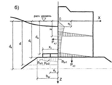 Рис. 2.1. Схема к расчету дифракции волн за одиночным молом: 1 - исходный луч; 2 - исходный створ; 3 - расчетный створ; 4 - граница волновой тени 2.28. Степень защищенности акватории порта и его причалов от волнения следует определять с учетом данных по расчетному судну и характеристикам отбойных устройств согласно рекомендациям раздела 4 и Приложения 5 настоящих Указаний. 3. НАГРУЗКИ И ВОЗДЕЙСТВИЯ ВОЛН НА ГИДРОТЕХНИЧЕСКИЕ СООРУЖЕНИЯ ВЕРТИКАЛЬНОГО И ОТКОСНОГО ПРОФИЛЯОбщие положения3.1. Нагрузки от стоячих волн на сооружения вертикального профиля и их элементы следует определять в соответствии с рекомендациями п.п. 3.6 - 3.16 настоящих Указаний. 3.2. Нагрузки и воздействия волн на сооружения вертикального профиля и их элементы (особые случаи) необходимо определять по СНиП 2.06.04-82*, п.п. 1.5*, 1.7, 1.8 и 1.10. 3.3. Нагрузки от разбивающихся и прибойных волн на сооружения вертикального профиля следует определять по СНиП 2.06.04-82*, п.п. 1.11 - 1.13. 3.4. Неразмывающие и максимальные донные скорости рекомендуется определять в соответствии с требованиями п.п. 3.17 - 3.20 настоящих Указаний. Нагрузки от стоячих волн на сооружения вертикального профиля3.5. Расчет сооружений на воздействие стоячих волн со стороны открытой акватории (рис. 3.1) должен производиться при глубине до дна db > 1,5h и глубине над бермой dbr > 1,25h; при этом h - высота бегущей волны, м, принимаемая в соответствии с требованиями Раздела 2 настоящих Указаний. 3.6. При расчетах сооружений на воздействие стоячих волн вместо глубины до дна db, м, необходимо использовать условную расчетную глубину d, м, определяемую по формуле d = df + dbr (db-df) где df - глубина над подошвой сооружения, м. Коэффициент kbr