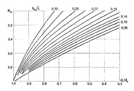 Рис. 3.1. Эпюры давления стоячих волн на вертикальную стену со стороны открытой акватории: а) при гребне волны, б) при ложбине волны (с эпюрами взвешивающего волнения давления на берменные массивы) Рис. 3.2. Графики значений коэффициента kbr Рис. 3.3.