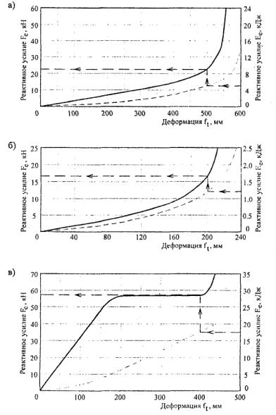 Рис. 4.1. Графики зависимости реактивного усилия Fe (сплошные линии) и энергии деформации Ee, (штриховые линии; от деформации/отбойных устройств: а - Д 1000 (1п.м.); б-Д 400(1 п.м.); е-РАТ-1000 5. ЛЕДОВЫЕ НАГРУЗКИ НА ГИДРОТЕХНИЧЕСКИЕ СООРУЖЕНИЯОбщие положения5.1. Нагрузки от морского однолетнего льда на гидротехнические сооружения должны определяться на основе статистических данных пятилетнего ряда наблюдений за физико-механическими свойствами льда, гидрометеорологическими и ледовыми условиями в районе строительства сооружения. 5.2. Основные прочностные характеристики ровного ледяного поля расчетной толщины - предел прочности при сжатии в направлении параллельном поверхности ледяного покрова - Rc и предел прочности при изгибе - Rf, МПа, следует вычислять по формулам: