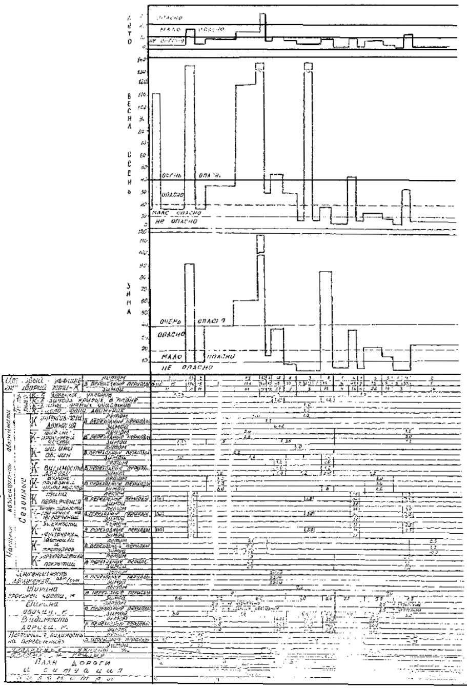 2. С учетом зон влияния дорожных элементов определяются величины частных коэффициентов аварийности для каждой дорожной ситуации и записываются в соответствующие строки формы графиков коэффициентов аварийности. 3. По табл. 2 устанавливаются сезонные поправочные коэффициенты и умножаются на соответствующие значения дорожных элементов. 4. По полученным от умножения значениям определяются величины частных коэффициентов аварийности (по табл. 1) для различных сезонов и записываются в соответствующие строки формы графиков коэффициентов аварийности. 5. Значения частных коэффициентов аварийности на участках с однородными условиями движения для каждого из сезонов перемножаются и определяются сезонные итоговые коэффициенты аварийности. 6. По полученным значениям сезонных итоговых коэффициентов аварийности строятся сезонные линейные графики. 7. На соответствующие сезонные графики коэффициентов аварийности условными обозначениями наносятся сведения о дорожно-транспортных происшествиях по сезонам года. III. Третий пример рассматривает порядок анализа сезонных графиков коэффициентов аварийности, приведенных на рис. 2. Для этой цели все значения сезонных графиков коэффициентов аварийности по участкам сводятся в таблицу. После этого, по данным табл. 6 составляется сводная ведомость опасных участков на дороге, выявляются причины повышения опасности движения и намечаются мероприятия по повышению безопасности движения (табл. 7). Таблица 6