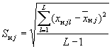 и сравнивают его с табличным значением этого критерия Gтабл для числа степеней свободы v = N - 1, соответствующего максимальной дисперсии, и f = L, соответствующего числу суммируемых дисперсий, и принятой доверительной вероятности Р = 0,95 (значения Gтабл приведены в приложении Е, таблица Е.1). Если Gm(max) > Gтабл, то соответствующее (S2ml)max из дальнейших расчетов исключают и процедуру повторяют до следующего по значению S2ml и т.д. до тех пор, пока Gm(max) не станет меньше либо равно Gтабл. 6.2.1.3 Не исключенные из расчетов S2ml считают однородными и по ним оценивают средние квадратические отклонения (далее - СКО), характеризующие повторяемость результатов единичного анализа (параллельных определений), полученных для содержания, соответствующего содержанию компонента в m-м OO. Эти СКО - Srm рассчитывают по формуле