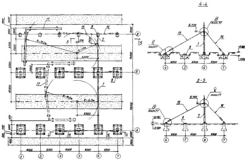 1 - фундамент по проекту; 2 - анкер А-1; 3 - анкерный болт М42 (по проекту); 4 - гайка М42; 5 - расчалка из каната; 6 - талреп, Q = 0,5 т; 7 - стойка рамы; 8 - скоба такелажная, типоразмер 1,7; 9 - рожковый зажим; 10 - хомут М-1; 11 - болт М12; 12 - анкер А-2; 13 - хомут М-2; 1. Узлы II - V замаркированы на л. 16. 2. Хомуты М-1, М-2, анкеры А-1, А-2 разработаны на л. 19. Схема поворота рамы вокруг подвижного шарнира (скольжением)