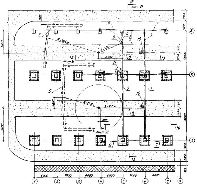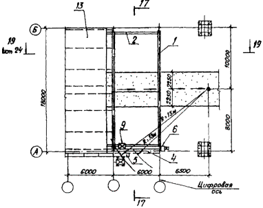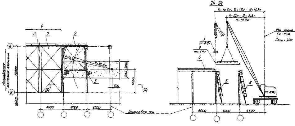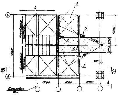 1 - рама 1; 2 - рама 2; 3 - полурама 1; 4 - полурама 2; (1, 2, 3, 4 - в проектном положении); 5 - положение рамы (полурамы) перед подъемом; 6 - расчалка РЧ-1; 7 - расчалка РЧ-2; 8 - временная распорка; 9 - центр тяжести полурамы; 10 - приставная лестница ЛА-4; 11 - подмости ЦНИИОМТП Монтаж каркаса пролетом 12 м (оси Б-В) начинать после монтажа всех конструкций пролета 18 м (оси А-Б) согласно схеме разбивки на очереди.