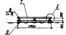 1 - рама каркаса; 2 - картина покрытия; 3 - панель доборная; 4 - смонтированная часть покрытия; 5 - приставная лестница ЛА-4; 6 - временная распорка; 7 - укрупняемая картина покрытия; 8 - дополнительный прогон; 9 - шаблон Ш-1; 10 - болт М12 Примечания. 1. Прогоны укрупнительных картин крепить к шаблону Ш-1 на болтах М12. 2. Конструкция шаблона Ш-1 дана на л. 29. 3. При укрупнительной сборке картин покрытия, имеющих два прогона, на шаблон укладывать дополнительный прогон (из несмонтированных) и крепить его аналогично прогонам картины. Схема монтажа покрытия ячейки (пролет 12 м)